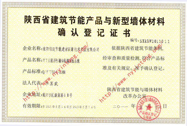 陜西省建筑節能產(chǎn)品與新型墻體材料確認登記證書(shū)