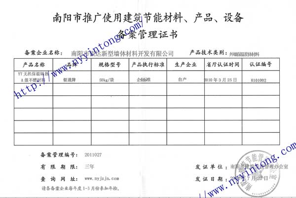 2011南陽(yáng)市推廣使用建筑節能材料、產(chǎn)品、設備備案管理證書(shū)